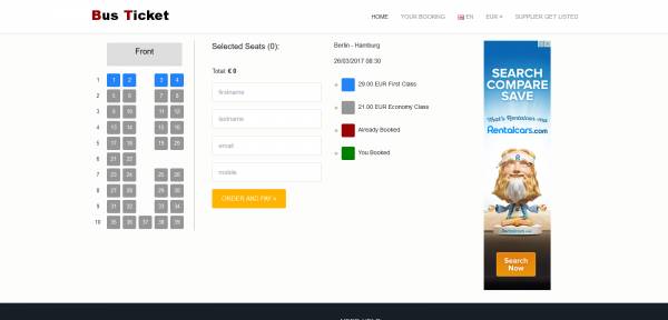 Complete turn key ready script to run a Bus Ticket Order booking portal on your location or worldwide. Suppliers can sign up / in to their own admin area and add their offers. Orders are send to client, supplier, admin. Use it for your own bus fleet or run it as an open portal for suppliers ... With Seat reservation system and bus seat plan creator ...