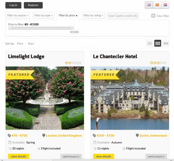 Users can post reviews and rate the travel packages. Filters by rating, price, type and country are available by default. Users can also sort vacation packages by price and rating, and choose between list, grid or map view.